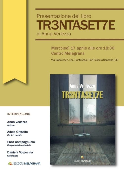 Mercoledì 17, alle 18:30, al Centro Melagrana di San Felice a Cancello, presentazione del libro Tr3ntaset7e di Anna Verlezza, Edizioni Melagrana. Interverranno al dibattito e alle riflessioni la responsabile editoriale delle Edizioni Melagrana, Vincenza Campagnuolo, Adele Grassito (Hecare) e la giornalista Daniela Volpecina.