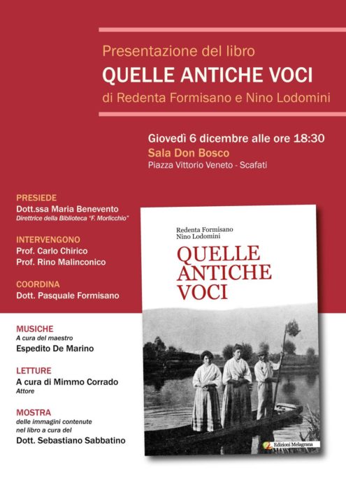 Giovedì 6 dicembre 2018 ore 18.30 presso la Sala Don Bosco, in Piazza Vittorio Veneto a Scafati (Sa) presentazione della raccolta di racconti “Quelle antiche voci” di Redenta Formisano e Nino Lodomini, Edizioni Melagrana. Presiederà l’evento la Dott.ssa Maria Benevento, Direttrice della Biblioteca “F.Morlicchio”; interverranno il Prof. Carlo Chirico e il Prof. Rino Malinconico. Musiche a cura del maestro Espedito De Marino, letture a cura dell’attore Mimmo Corrado e mostra delle immagine contenute nel libro a cura del Dott. Sebastiano Sabbatino.